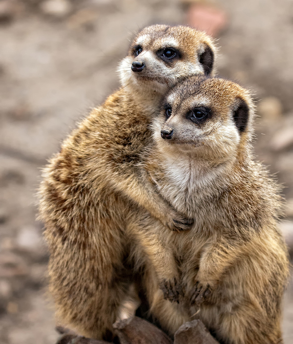 Suricatos (Suricata Suricata): Son conocidos como los "centinelas del desierto" o los "gatos de la roca" por los indígenas suajilis. Los suricatos son pequeños mamíferos de la familia de la mangosta, que viven en la región del desierto de Kalahari y el Namib en África. Son animales simpáticos que se agrupan en colonias de hasta 40 miembros y es muy característico verles permanecer de pie sobre sus extremidades traseras.
