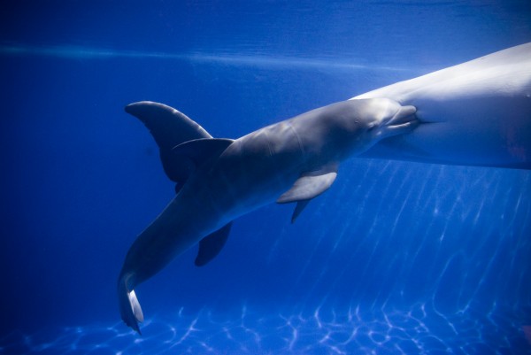 Los delfines del Zoo tienen novedades: las dos pequeñas crías han cumplido medio año y siguen su proceso de aprendizaje general entre juego y juego. Una de las tareas más importantes es la de enseñarles a comer pescado, un proceso que en la naturaleza se inicia por imitación. En nuestro caso, se ofrece a las crías la posibilidad de coger pescado para que lo manipulen, jueguen y se acostumbren. Con los días, finalmente ingieren algún pequeño pedazo. Como con todos los procesos de entrenamiento, la clave es la paciencia; y saber que se trata de un proceso lento pero que no tendrá marcha atrás. Nuestros delfinitos Rumbo y Romeo comen ya más de medio kilo de pescado al día, aunque siguen reclamando su ración láctea de sus madres, Mancha y Mary respectivamente.