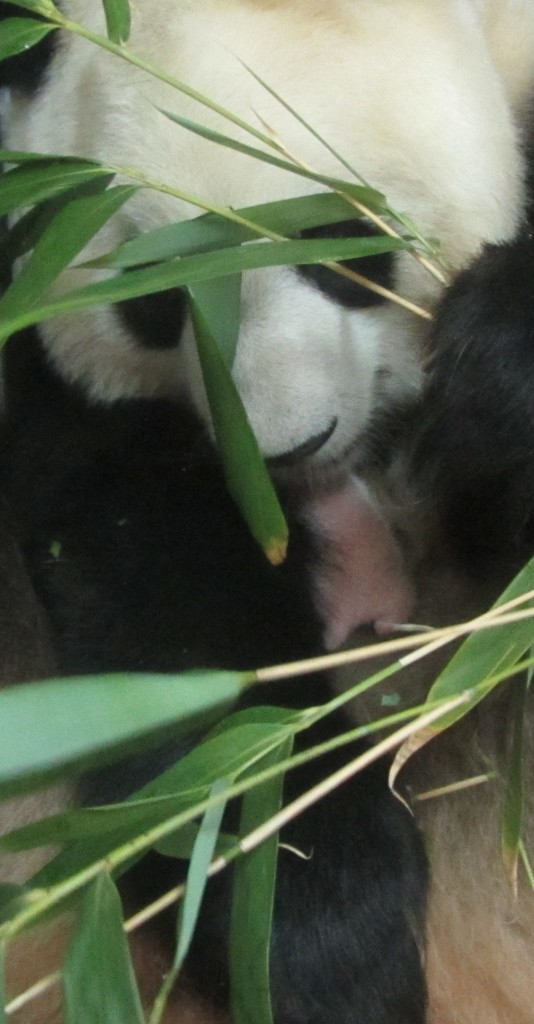 Una vez más, hemos constatado que Hua Zui Ba es una excelente madre y amamanta a su cría con esmero, cada 3-4 horas. A veces, la madre se toma un pequeño paréntesis para saborear sus primeros bocados de bambú, después de haber recuperado el apetito tras el parto, pero el resto del tiempo mantiene en su regazo a la cría, arropándola con ternura.